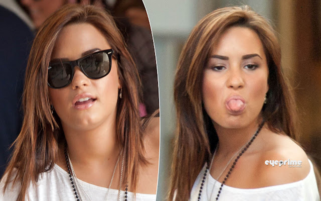 Demi Lovato shows of her new blonder hairstyle and sticks her tongue out as she departs LAX